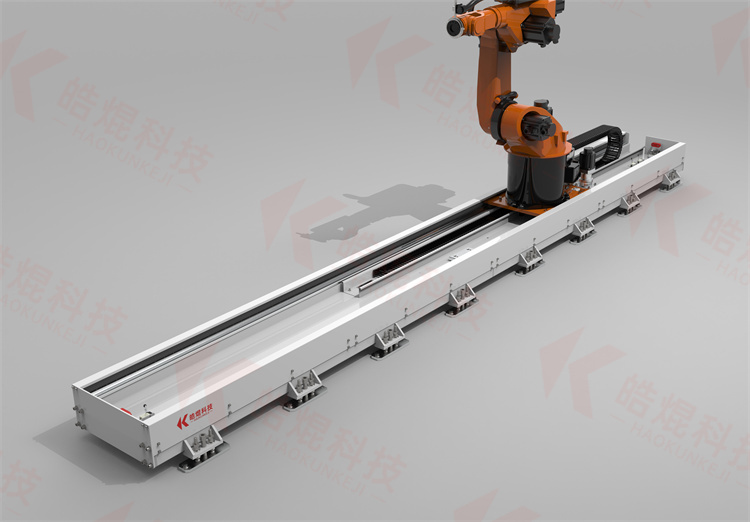機器人第七軸采用矩形導軌和硬質滾輪作為運動導軌來代替直線導軌,優(yōu)點是能夠提供準確、耐用、低摩擦的線性導軌,特別適用于移動自動化設備的重物。軸承座采用帶密封、免維護圓錐滾子和深溝球軸承的滾輪。矩形導軌是采用整體淬火和精密研磨而成,與齒輪齒條及精度減速機組合,以提供一個強大的,準確的第七軸。
