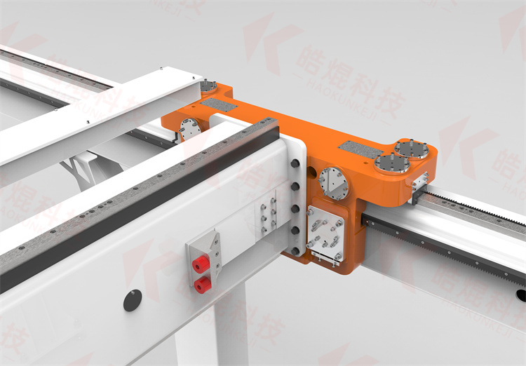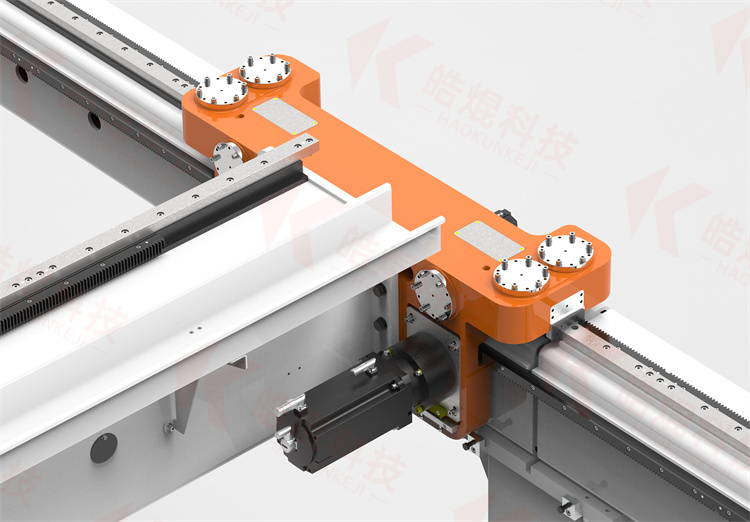 桁架機(jī)器人由多維機(jī)器人行走軸搭建而成。各機(jī)器人行走軸由型鋼焊接而成,滾輪直線導(dǎo)軌和齒輪齒條及伺服電機(jī)等組成。作為運(yùn)動(dòng)框架和載體的型鋼其截面形狀通過(guò)有限元分析法來(lái)優(yōu)化設(shè)計(jì),生產(chǎn)中的精益求精,確保其強(qiáng)度和直線度,采用滾輪距型導(dǎo)軌作為運(yùn)動(dòng)導(dǎo)軌,運(yùn)動(dòng)傳動(dòng)機(jī)構(gòu)采用減速機(jī)和齒輪齒條或滾珠絲杠。